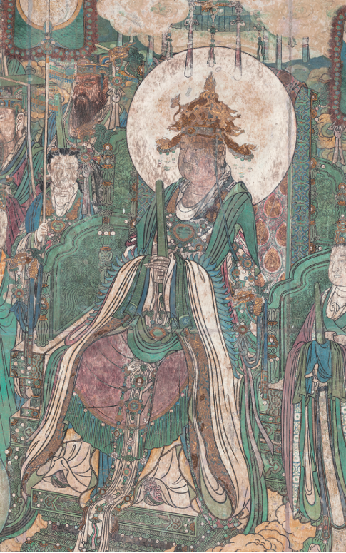 《朝元圖》的壁畫(huà)構(gòu)圖宏偉,以青龍、白虎星君為先導(dǎo),神龕背面的三十二天帝君為后衛(wèi),玉皇大帝、后土皇地祇等八位主神率二百余位神仙朝謁元始天尊?!冻獔D》畫(huà)師繼承“吳帶當(dāng)風(fēng)”的韻味,以元代雄渾圓潤(rùn)的筆調(diào)賦予人物翩然神采,高超的線描技法,畫(huà)人物須眉畢現(xiàn),畫(huà)器具扣之有聲,所用石青、石綠、朱砂、赤金等天然礦物顏料,歷經(jīng)700年依舊光彩奪目。