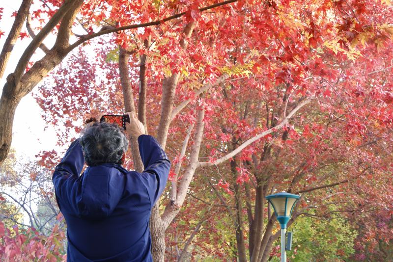 游客在遐觀園拍攝紅葉。玉淵潭公園供圖