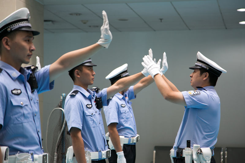 于寶(右)正在對(duì)新警開(kāi)展交警手勢(shì)培訓(xùn)。首都機(jī)場(chǎng)公安供圖